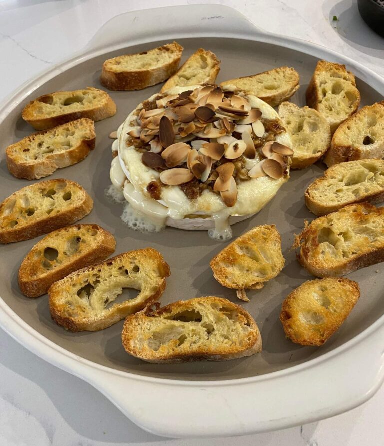 - Bake for 8–10 minutes, or until the baguette slices are golden brown and the Brie begins to soften.