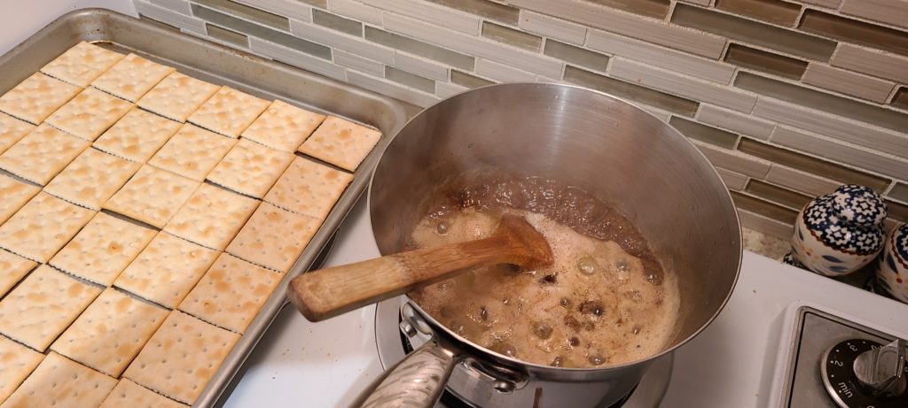 • Pour over the crackers, making sure you cover the whole pan.
